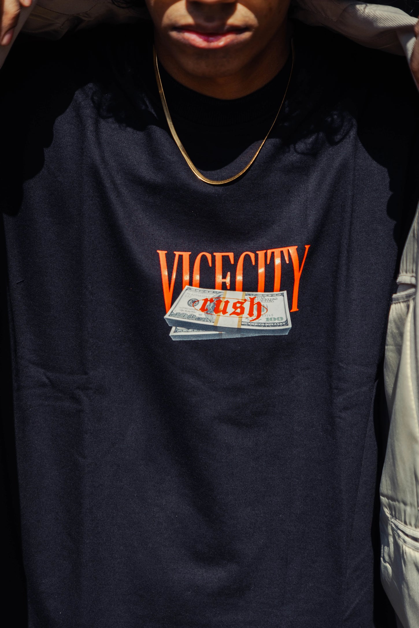 On the front, you’ll see a stacked bundle of bills stamped with our “Rush” logo and neon-red “VICE CITY” text, nods to cold hard cash ruling the streets and the iconic 1980s Miami palette. This single image symbolizes territory and power struggles, fragile alliances, and brutal betrayals that define both Scarface and Vice City. Spot the tiny chainsaw silhouette hiding in plain sight? That’s our tribute to Scarface’s infamous bathroom scene, a detail only true fans will catch. Together, these elements fuse decades of pop-culture lore into one compact design.
